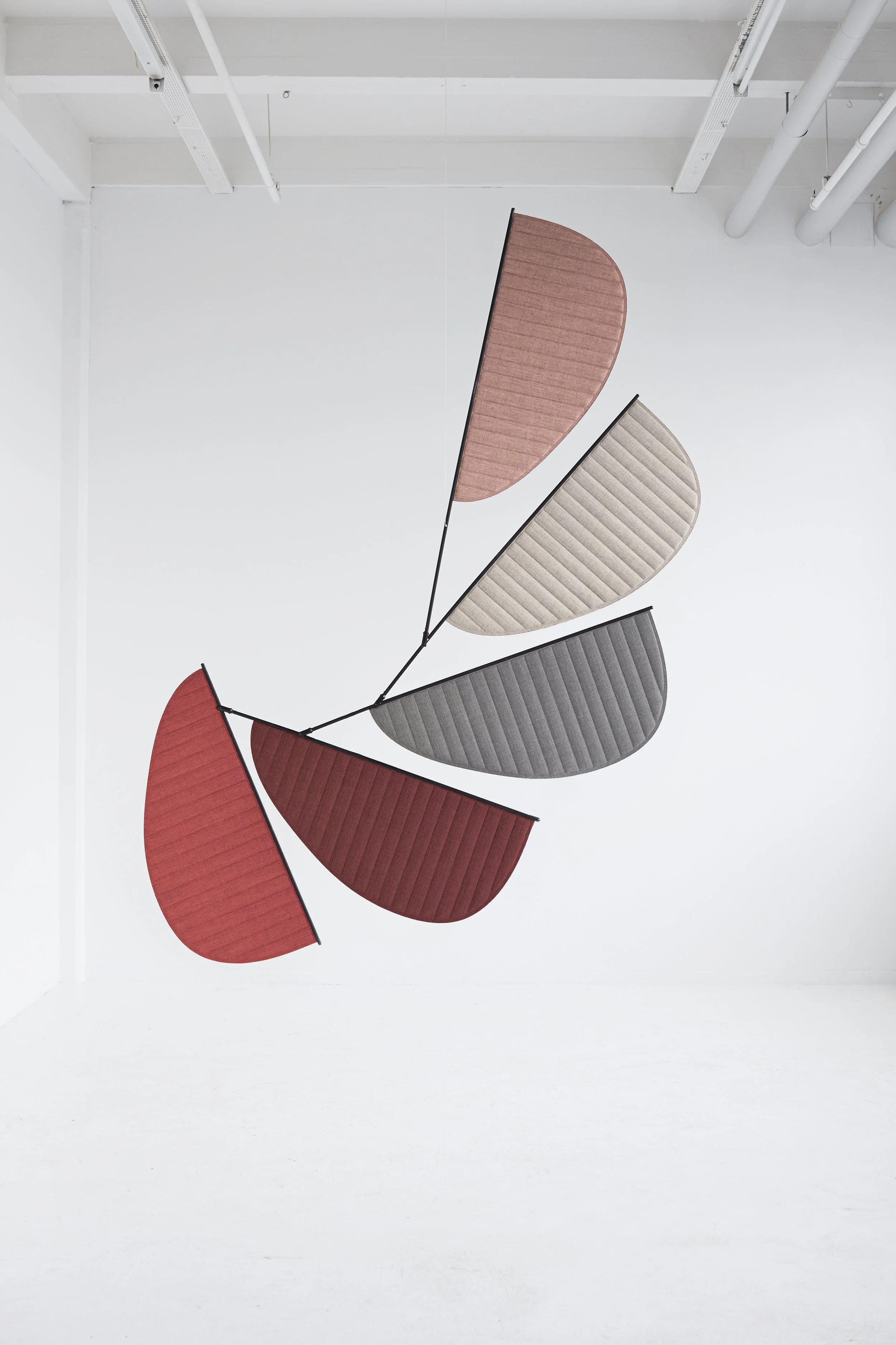 Each day is a research to find balance in life. The product is meant to remind us of that. Mobiles in the tradition of Alexander Calder hung from the ceiling, dividing through modern partitions the space into smaller intimate areas. The project aims to industrialize these artistic sculptures, through the industrialization of modular components. The physical balance of the elements allows the composition with different number oftextile"petals", giving the possibility to create several configurations. The Balance system combine textiles and metal elements. In addition to being sculptural and room dividers, the mobiles are also sound absorbers – a feature which is invaluable in a space.
