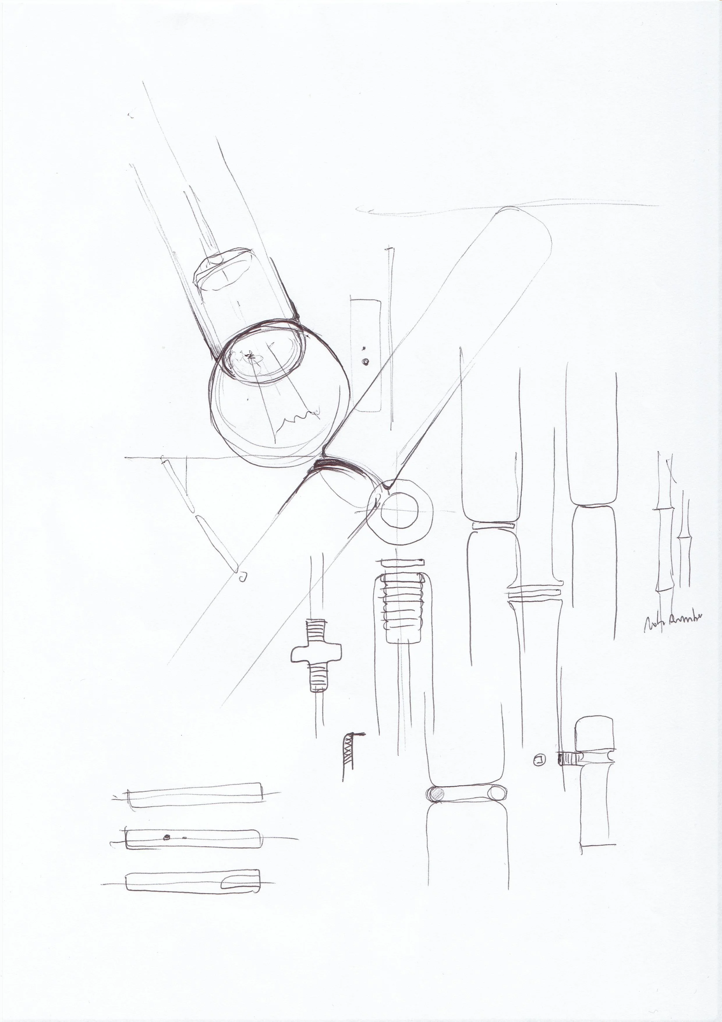 The Not bamboo lamp, is a unique lighting fixture that makes use of a single repeating element, allowing for infinite extensions. These elements are crafted from wood and have interior holes for threading the electrical cables. The lamp consists of three variations of this element: an extension piece, a socket component, and a suspension part. Additional extension elements can be added as needed. The lamp's design focuses on showcasing its construction, creating a visually striking effect of concentric circles in the wood, reminiscent of bamboo but distinct enough to earn its name, the 'Not bamboo lamp.' This design choice adds a graphical and organic touch to the fixture.